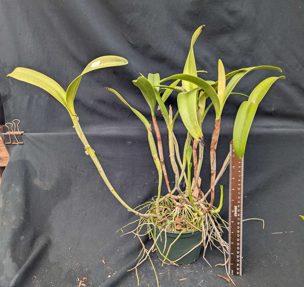 This plant is in a 6" pot and blooming size. This particular variety opens as a light yellow and as days go by it lightens until it is creamy white with color lip. The pictures show actually how the flowers look when they have just opened and days later. The plant picture is the actual plant we are offering. The plant won't be in bloom when we ship it.
