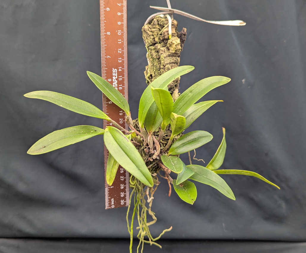 This plant is mounted and about 2 years to bloom. We expect very waxy coerulea flowers with a dark lip. The picture of the flowers is of a different clone of the same cross, the plant picture is of the actual plant we are selling.