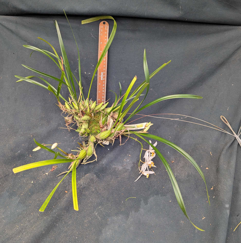 These plants are blooming size and overgrown in a 3" hanging basket. This is one of the compact growing Coelogyne. Very fragrant. Pictures are of the actual plant we are selling and the flowers it gives. The plant will be shipped without flowers